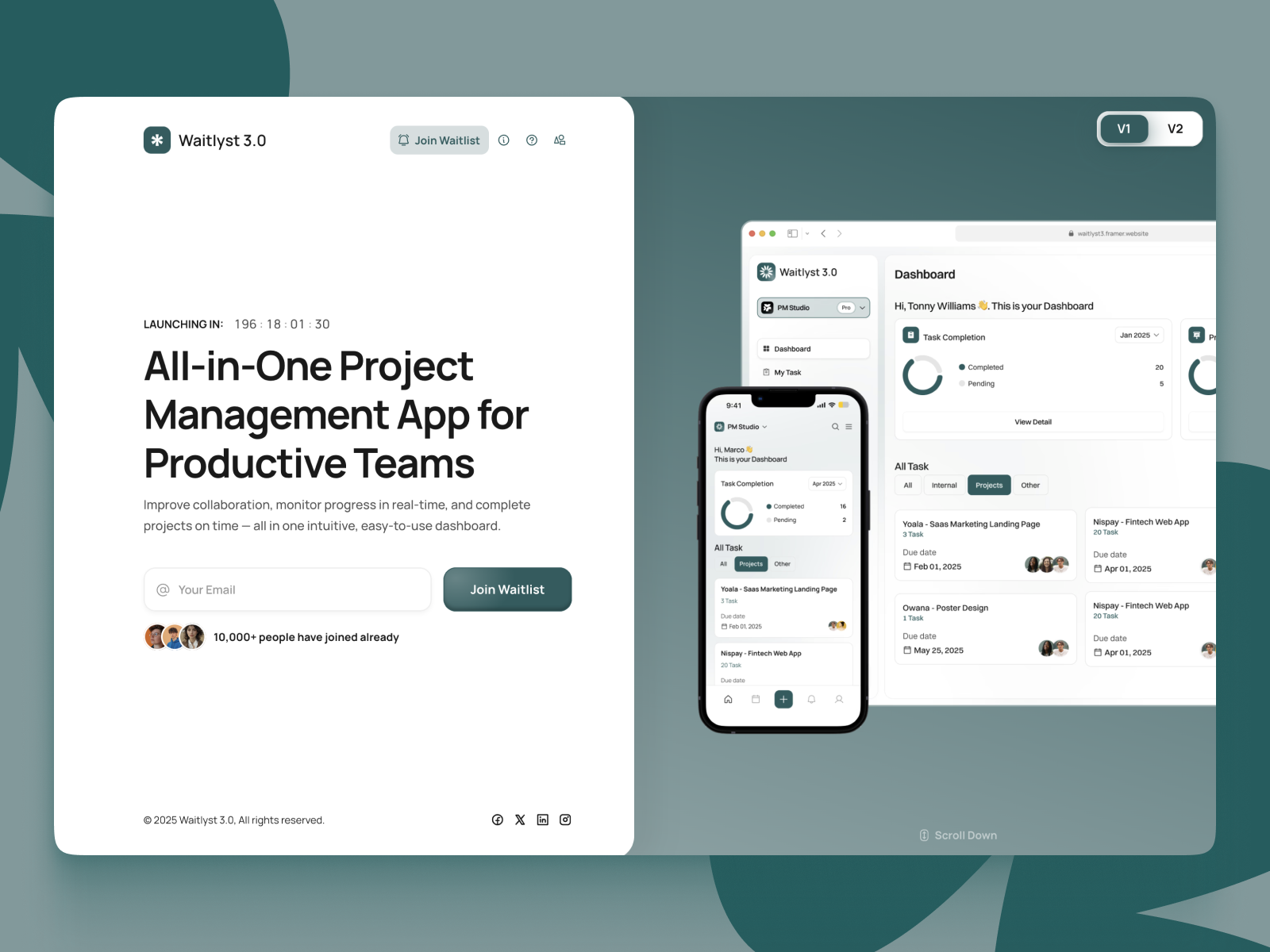 Avvio is a sleek, minimal yet advanced & totally free waitlist template for Framer, perfect for launching products and capturing early users. Live Demo → Key Features: 2 Beautiful Waitlist VariantsChoose between two modern page styles.Scroll-Triggered Content TransitionsEngaging smooth scroll effects that update content dynamically.Minimal & Clean AestheticDesigned for focus and conversion.Streamlined Sign-Up FlowOptimized for simplicity and speed.Polished Interactions & Micro-DetailsSubtle animations that elevate the user experience.Fully CustomizableEasily tweak to match your brand and needs.High-Converting LayoutBuilt with performance and conversion in mind.100% ResponsiveLooks great on all devices.Completely FreeNo strings attached — download and launch right away.