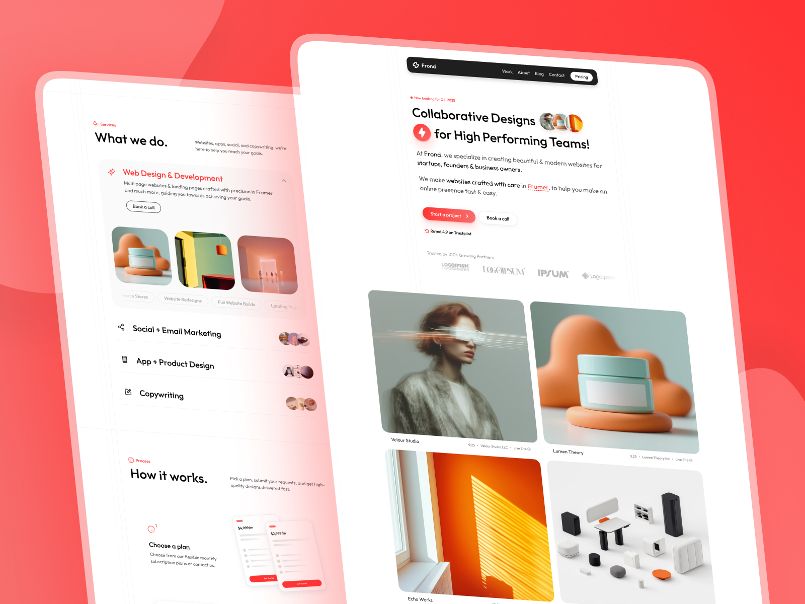 Frond is a Minimal Design Agency Template for Framer, crafted with care and precision. It blends modern aesthetics with seamless functionality — perfect for creative studios and designers who value clarity, balance, and timeless style. Features 8+ Unique PagesMinimal Grid DesignFully Responsive LayoutChange Color Scheme in One-Click4 CMS Collections (Work, Blog, Author and Categories)Beautiful Page Transition AnimationsConversion Focused DesignInteractive Services SectionElegant Hover EffectsGreat Customer Support