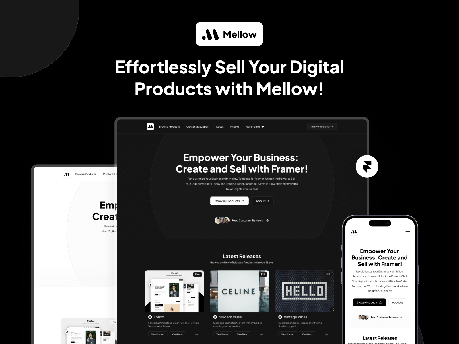 🎉 Introducing Mellow Template for Framer - Start Selling Your Digital Products Today! Turn your creative ideas into profitable digital products with the help of Mellow Template for Framer. This robust template provides limitless customization options via the Framer design tool and seamless integration with the LemonSqueezy Ecommerce Platform, enabling you to launch your digital store quickly. See Demo Here → With 9+ Unique Pages, Complete Responsive Design, Stunning Animations, and more, this template is a must-have. Try it out and see how you can quickly start selling in no time. Comes with amazing features: 9+ Unique Pages2 CMS Collections (for Products & Testimonials)Light & Dark Mode SupportClean & Responsive DesignBeautiful Mega Menu DesignSmooth AnimationsPricing Tables with Monthly/Yearly SwitchMultipurpose DesignAnd a Lot More (If I listed everything, we’d be here all day 🤭)