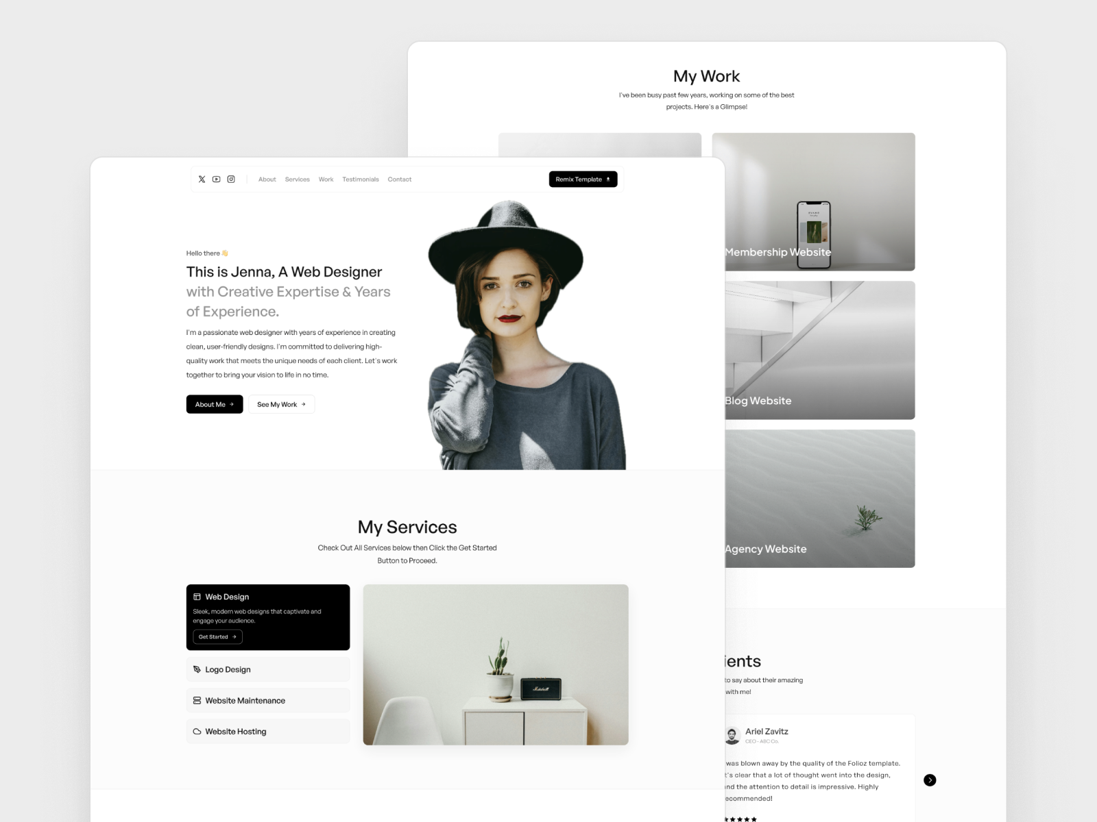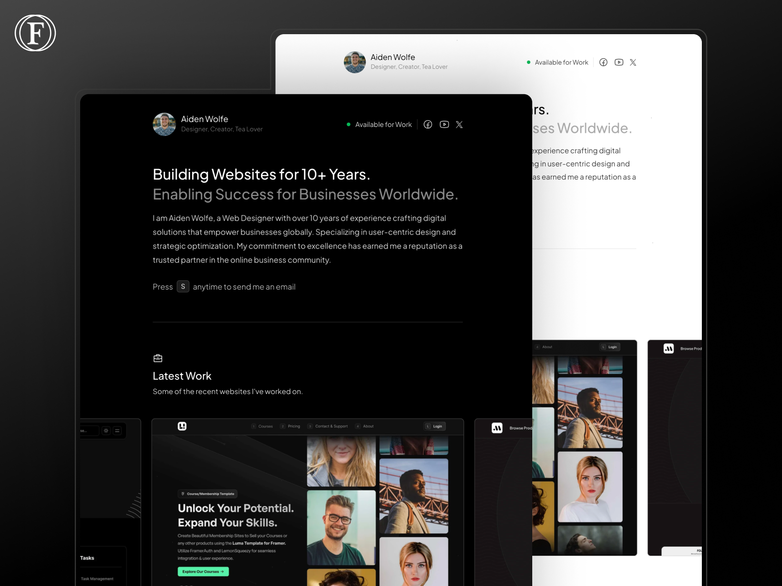 Folioz is a Minimal and Clean Personal Portfolio Template for Framer that is great for Freelancers, designers, Simple Portfolio sites, and more. See Live Demo → Amazing Features: Clean & Minimal DesignStunning Hover EffectsBeautiful Horizontal Services TabsCMS Integrated to showcase your WorkProjects Card Hover Effect with Custom CursorMinimal Testimonials CarouselMobile Responsive Check Out my other Popular Templates: LumaMellowDocifySleekfolio