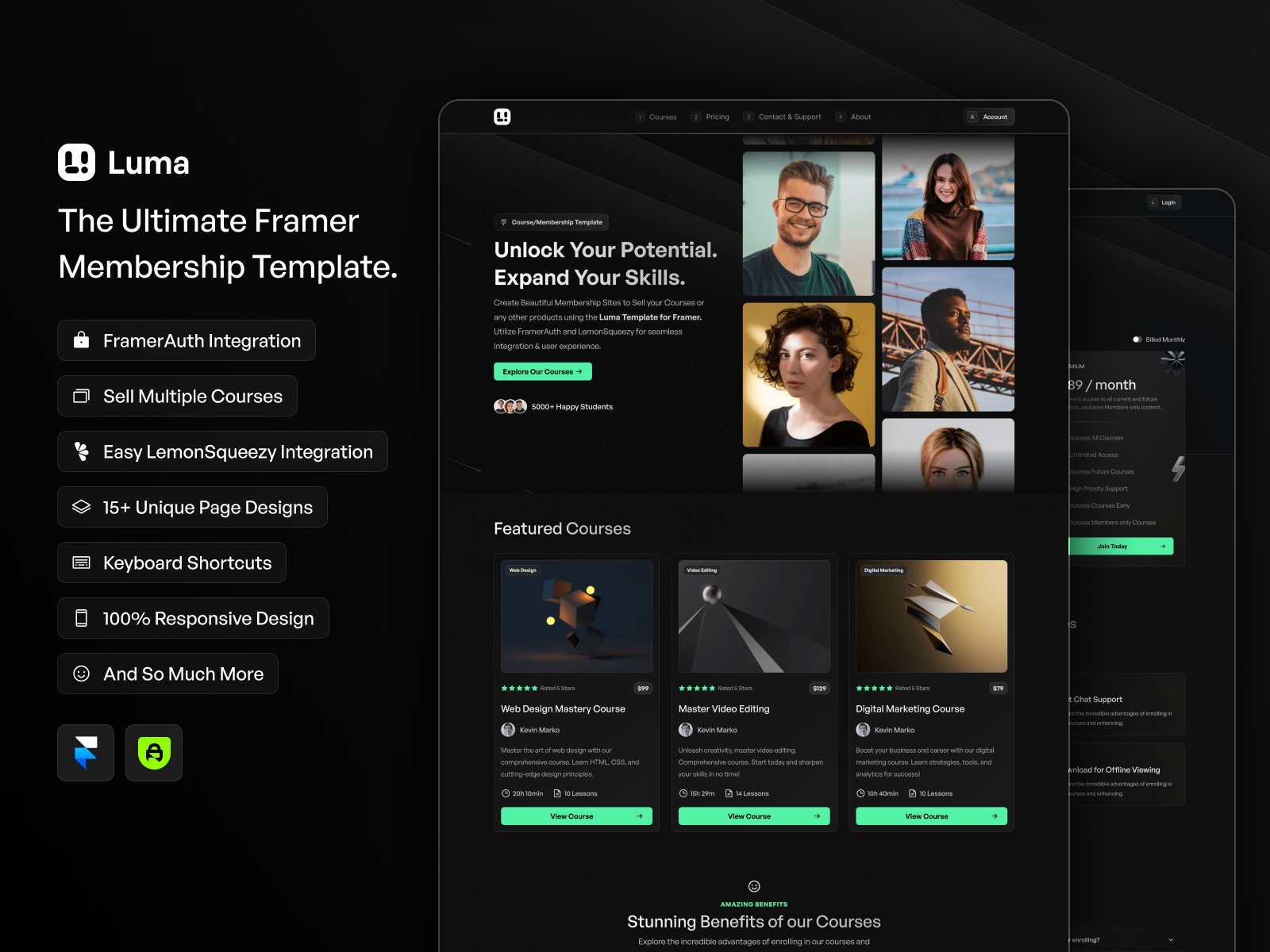 🔥 Introducing Luma - Most Powerful Membership Template for Framer Luma is the First ever Framer Template that allows you to quickly Sell multiple Courses and your Membership Content. Click to See Live Demo → Create impressive membership sites effortlessly with Framer using Luma. Benefit from seamless integration with FramerAuth and LemonSqueezy for quick setup and easy selling. Delight your audience with exceptional design and learning opportunities. Experience it today for a seamless journey into stunning membership site creation! Key Features of Luma: 15+ Unique PagesFramerAuth IntegrationLemonSqueezy IntegrationKeyboard Shortcuts2 CMS Collections (Courses & Lessons)Fully ResponsiveA Beautiful Full-Screen Mobile MenuStunning Functionalities & EffectsA Modern Dark Design with 3D TouchAnd a lot more FramerAuth is required for membership features & is purchased separately. Click to See Promo Video (50 secs) → Click to See all features of Luma template →