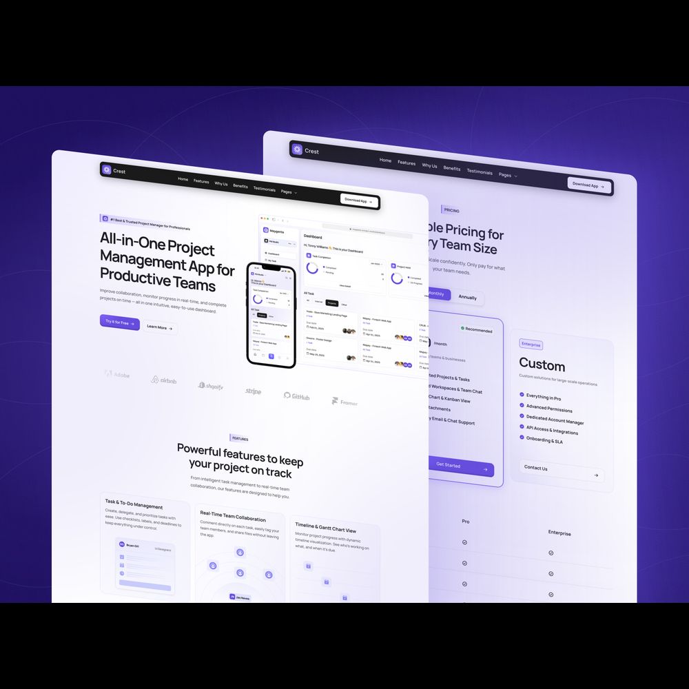 Crest is a clean, modern app website template for Framer. With 12+ pages, launch your app with style. Fast, responsive, and easy to customize. Perfect for startups and tech teams. No coding required. Live Demo → Features: 12+ Unique PagesProfessional & Modern DesignFully Responsive LayoutChange Color Scheme in One-Click4 CMS Collections (Blog, Author, Categories & Changelog)Beautiful AnimationsConversion Focused DesignStunning Mobile MenuMobile Responsive Comparison Table (Pricing Page)Great Customer SupportAnd a lot more Figma File Included (Only homepage).