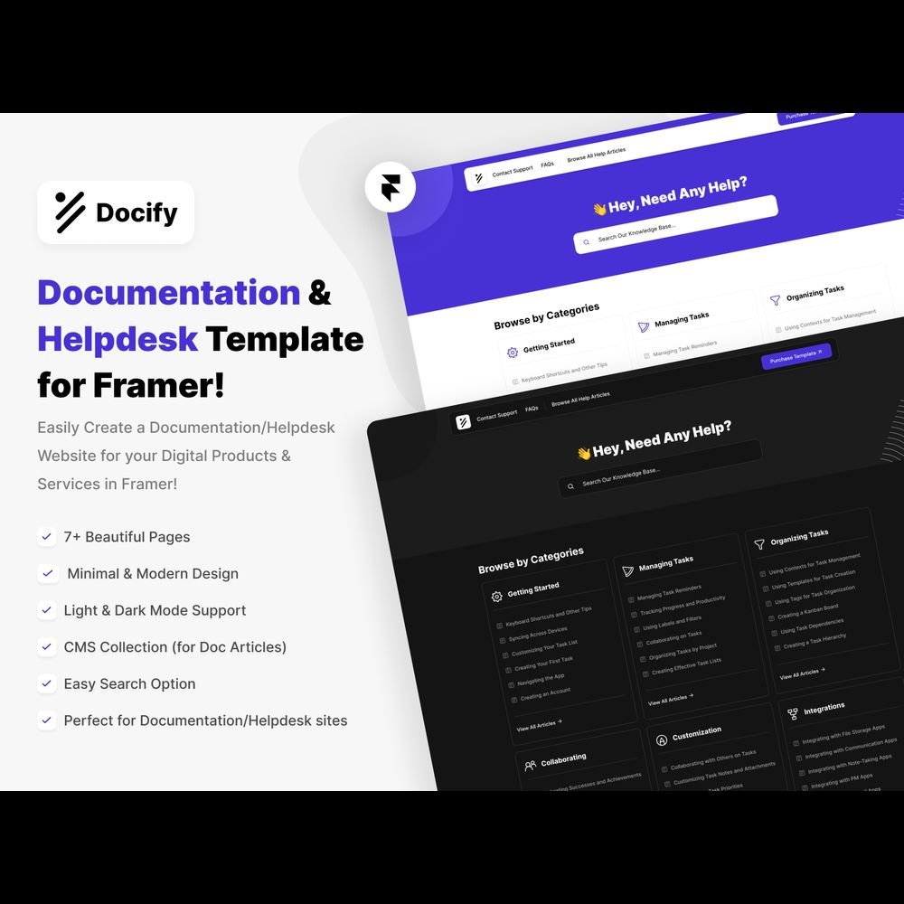 🥳 Introducing Docify Template for Framer - Easily Create a Documentation/Helpdesk Website with Framer in no time! 🚀 Docify Template for Framer simplifies the process of building a polished Documentation/Helpdesk Website using Framer. This template allows you to swiftly create help articles and provide top-notch customer support. See Demo here → Docify Template's minimalist design ensures a clean and professional look for the website while Streamlining the task of creating a world-class Helpdesk system right inside Framer, allowing you to focus on delivering quality content to your customers. Comes with Stunning Features You'll Love: 7+ Beautiful PagesMinimal & Modern DesignLight & Dark Mode SupportCMS Collection (for Doc Articles)Easy Search OptionPerfect for Documentation/Helpdesk sitesAnd a lot more... 🤯 Docify Changelog V1.1.1: Added Theme Switcher Toggle in the NavigationImproved the Navigation DesignImproved overall entrance animations of the template V1.1: Added 2 New Pages (Privacy Policy & Terms)Added a new Dropdown in the Main Header with a list of pages (Can be customized to show anything)Improved Design LanguageImproved on Dark Mode V1.0: Initial Release of Docify Template for Framer