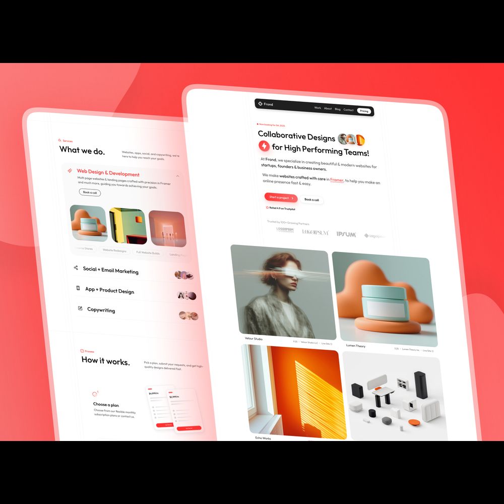 Frond is a Minimal Design Agency Template for Framer, crafted with care and precision. It blends modern aesthetics with seamless functionality — perfect for creative studios and designers who value clarity, balance, and timeless style. Features 8+ Unique PagesMinimal Grid DesignFully Responsive LayoutChange Color Scheme in One-Click4 CMS Collections (Work, Blog, Author and Categories)Beautiful Page Transition AnimationsConversion Focused DesignInteractive Services SectionElegant Hover EffectsGreat Customer Support