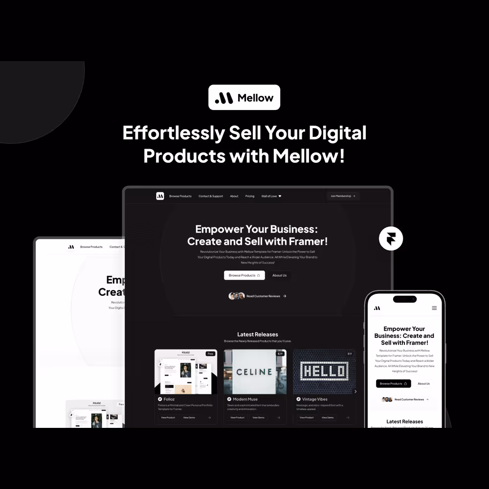 🎉 Introducing Mellow Template for Framer - Start Selling Your Digital Products Today! Turn your creative ideas into profitable digital products with the help of Mellow Template for Framer. This robust template provides limitless customization options via the Framer design tool and seamless integration with the LemonSqueezy Ecommerce Platform, enabling you to launch your digital store quickly. See Demo Here → With 9+ Unique Pages, Complete Responsive Design, Stunning Animations, and more, this template is a must-have. Try it out and see how you can quickly start selling in no time. Comes with amazing features: 9+ Unique Pages2 CMS Collections (for Products & Testimonials)Light & Dark Mode SupportClean & Responsive DesignBeautiful Mega Menu DesignSmooth AnimationsPricing Tables with Monthly/Yearly SwitchMultipurpose DesignAnd a Lot More (If I listed everything, we’d be here all day 🤭)