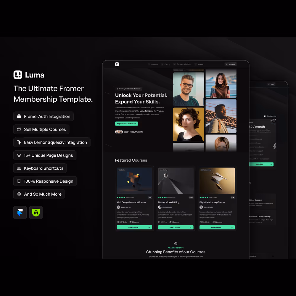 🔥 Introducing Luma - Most Powerful Membership Template for Framer Luma is the First ever Framer Template that allows you to quickly Sell multiple Courses and your Membership Content. Click to See Live Demo → Create impressive membership sites effortlessly with Framer using Luma. Benefit from seamless integration with FramerAuth and LemonSqueezy for quick setup and easy selling. Delight your audience with exceptional design and learning opportunities. Experience it today for a seamless journey into stunning membership site creation! Key Features of Luma: 15+ Unique PagesFramerAuth IntegrationLemonSqueezy IntegrationKeyboard Shortcuts2 CMS Collections (Courses & Lessons)Fully ResponsiveA Beautiful Full-Screen Mobile MenuStunning Functionalities & EffectsA Modern Dark Design with 3D TouchAnd a lot more FramerAuth is required for membership features & is purchased separately. Click to See Promo Video (50 secs) → Click to See all features of Luma template →